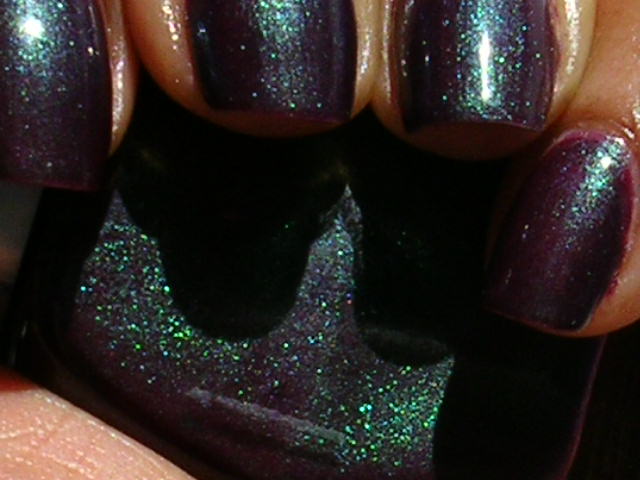 It's an awesome formula, red based purple shimmer with flashes of a green/blue metallic duo-chrome. Not as metallic as Galaxy Girl from Orly, just different :)