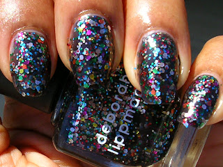 This has the same type of glitter as "Happy Birthday" but in a sticky sweet bubble gum pink base. It was opaque in 2 coats, but I did 3 coats to get "layer-upon-layer" of glitter. :)
