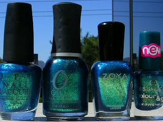 L to R: OPI "Catch me in your net", Orly "Halley's Comet", Zoya "Charla" (gave me smurf nails), and Essence "Choose Me!".