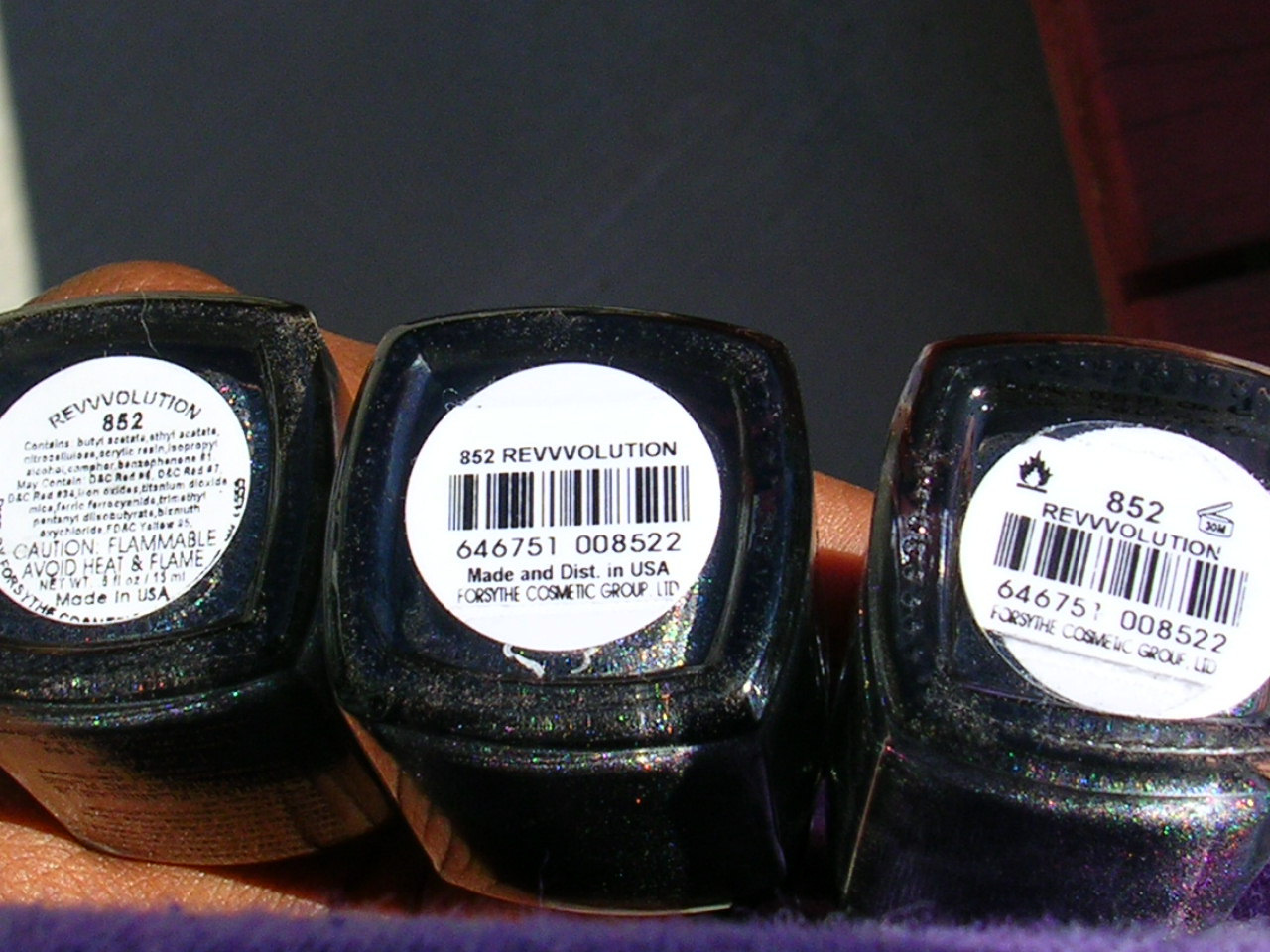 The label on my bottle looks closest to the one on the far right, but it's missing those two symbols in the corners. I got mine from 8ty8Beauty. I haven't worn it yet on my nails, but I did a swatch of it on my nail wheel and when I took it in the sun it didn't really wow me. I might have gotten a dud, but I'm hoping not. It's a really beautiful color.