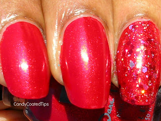 This is a pink based red shimmer with added gold micro flecks. The micro-flecks shimmer gold and pink, so pretty! It's the perfect red for summer without being too deep like most reds for Fall. I wanted to make sure I got the full richness of the red, so I applied three coat even thought it was fully opaque in two coats.
