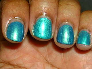This color was a bright aqua blue, very pretty, but sheer and needed 3 coats to combat the evil "V.N.L.- visible nail line".